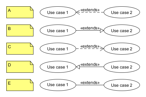 Aufgabe: Wenn der Use Case 1 in Anspruch genommen wird, dann soll auch der Use-Case 2 in Anspruch genommen werden. Welche Darstellung ist richtig?