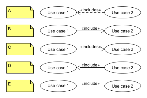 Aufgabe: Wenn der Use Case 1 in Anspruch genommen wird, dann soll auch der Use-Case 2 in Anspruch genommen werden. Welche Darstellung ist richtig?