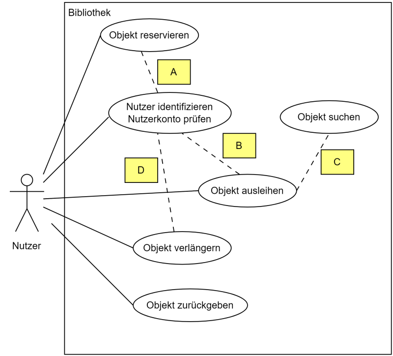 Aufgabe: Das dargestellte Anwendungsfall Diagramm zeigt die Anwendungsfälle in einer Bibliothek. Ordnen Sie richtig die include und extends Beziehungen zu!