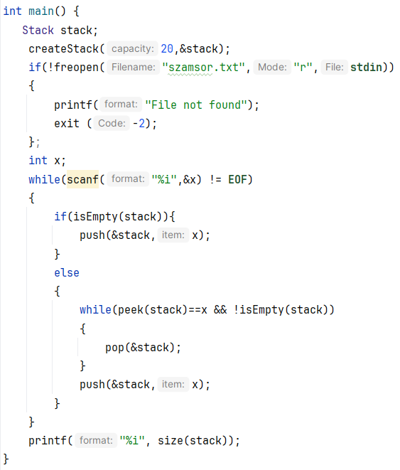 Mit ír ki a képen látható program, ha a a createStack függvény létrehoz egy 20 elemű üres vermet, az isEmpty teszteli ha üres a verem, a push bevisz egy űj elemet, a pop függvény kivesz a veremből egy elemet, a size visszatéríti a verem elemeinek a számát és a peek függvény visszatéríti a verem legfelső elemét. A szamsor.txt állomány tartalma: 20 5 5 9 3 7 5 9 9 5?