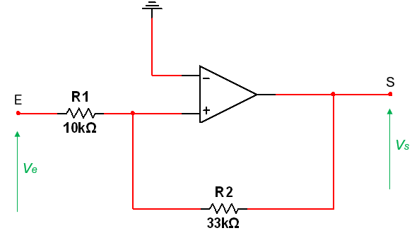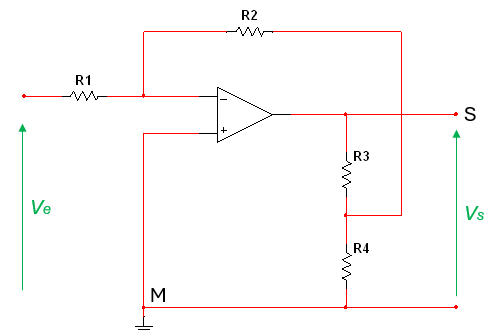 Sachant que R1 = R3 = 30 k, R2 = 100 k et R4 = 1 k. Calculer l'impédance d'entrée Ze :Donner les valeurs en k, sans l'unité.