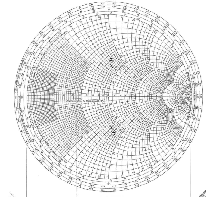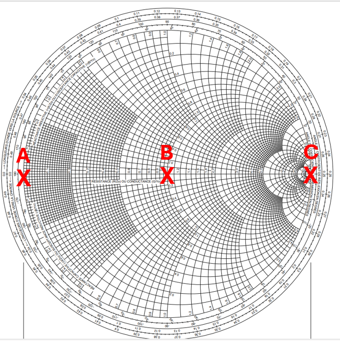On se déplace dans le sens des aiguilles d'une montre le long d'un cercle de coefficient de réflexion constant sur l'abaque de Smith (voir l'abaque ci-dessous).