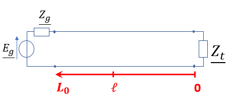 It is assumed that the load impedance is different from the characteristic impedance of the line. This results in voltage antinodes (maximum amplitude) and nodes (minimum amplitude). The distance between two successive voltage antinode and node isWe consider a transmission line of length and a characteristic impedance connected to a generator delivering a sinusoidal voltage and to a load of impedance .