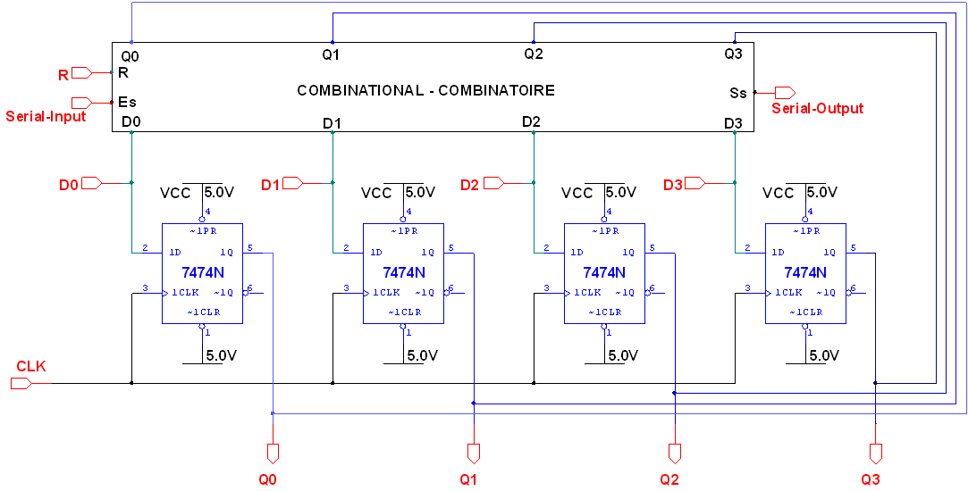 Soit un registre à décalage bidirectionnel réalisé avec 4 bascules D. Ce circuit présente les E/S suivantes :