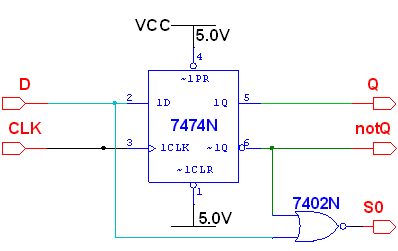 On considère le circuit de la figure ci-dessous réalisé avec des bascules D. Dérouler le chronogramme des différents signaux et indiquer la valeur de la sortie S0 en réaction à chaque front descendant de la donnée D