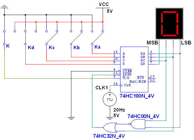 Nous reprenons le compteur décimal (0 à 9) intégré 4 bits que nous avions expérimenté en TP et nous rappelons ses E/S :