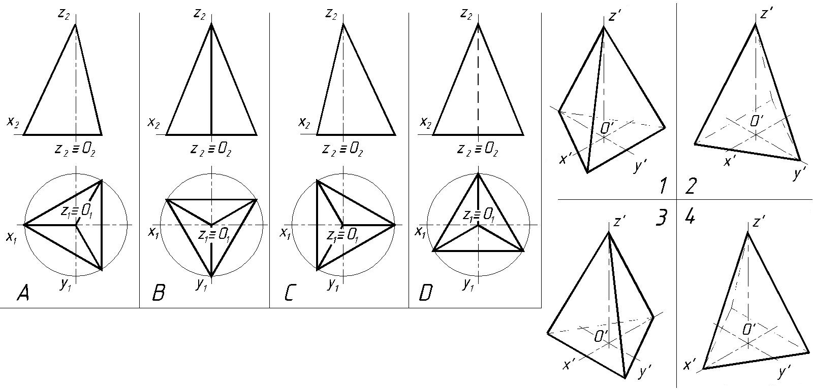 Визначити відповідність між ортогональними проекціями геометричних тіл та їх аксонометріями. |