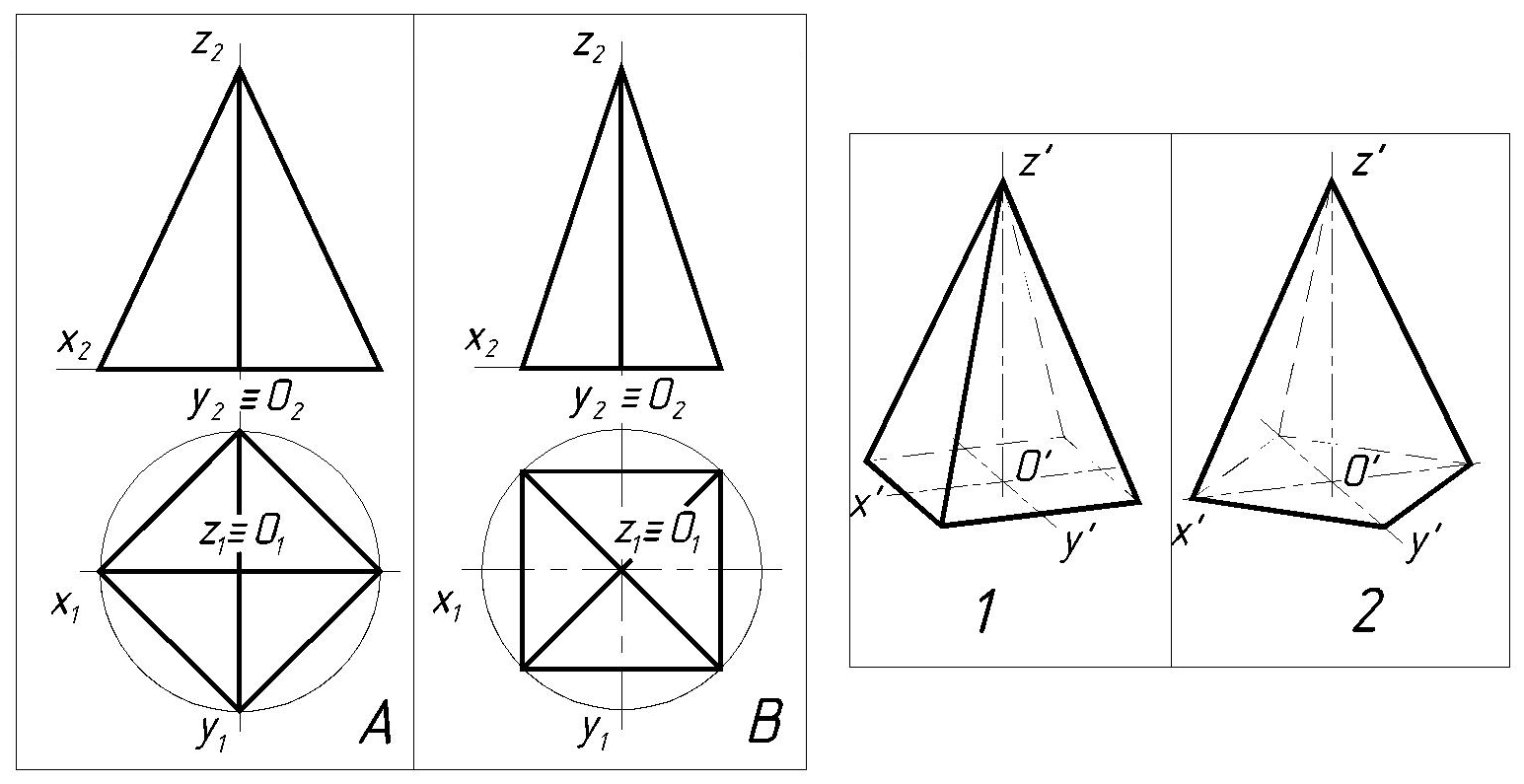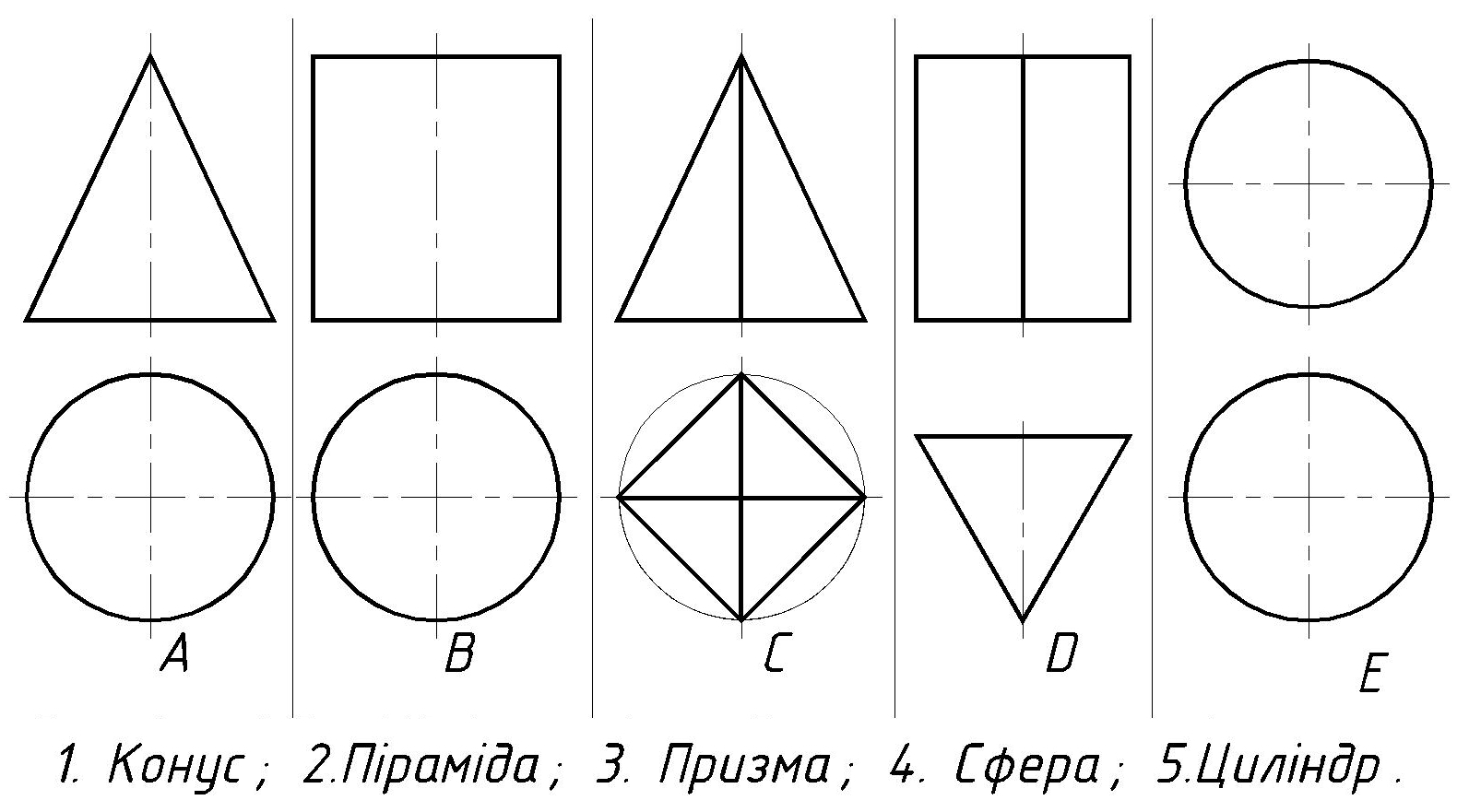 Визначити відповідність між ортогональними проекціями геометричних тіл та їх аксонометріями. |