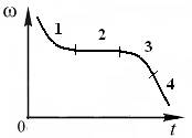 На графике представлена зависимость модуля угловой скорости ω вращающегося тела от времени t. Участок графика, которому соответствует вращение с убывающим по величине угловым ускорением, имеет номер