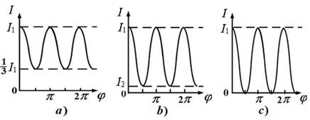На рисунке представлены графики зависимости интенсивности I света, прошедшего через поляризатор, от угла поворота φ поляризатора для трех разных световых пучков.