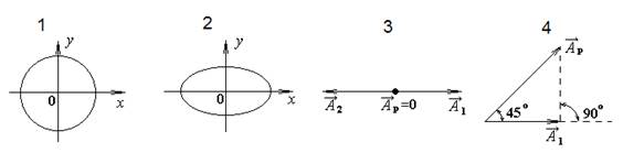 На рисунке под номерами 1, 2 изображены траектории результирующего движения при сложении двух взаимно перпендикулярных гармонических колебаний, а под номерами 3, 4 – векторные диаграммы сложения гармонических колебаний одного направления и одинаковой частоты (, – векторы амплитуд складываемых колебаний,  – вектор амплитуды результирующего колебания). Амплитуды складываемых колебаний равны для случаев, приведенных под номерами