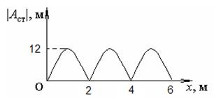 На рисунке приведен график модуля амплитуды стоячей волны от координаты х. Длина волны  бегущей и отраженной волн, при наложении которых получена эта стоячая волна, равна … м.