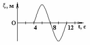 В упругой среде распространяется плоская монохроматическая волна. В начальный момент времени t = 0 все частицы среды находились в покое. На рисунке приведен график зависимости от времени смещения частицы, отстоящей от источника колебаний на расстояние х = 1 м. Циклическая частота волны равна … рад/c.