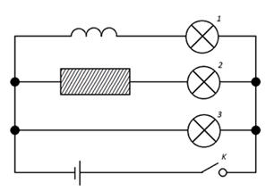 На рисунке представлена электрическая схема. После замыкания ключа сила тока позже достигнет своего максимального значения в лампе (-ах)