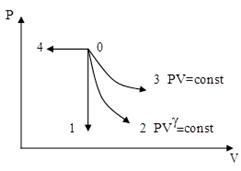 Система может перейти из состояния 0 в состояния 1,2,3,4 (см. рисунок;  – показатель адиабаты). Энтропия системы возрастает в процессе: