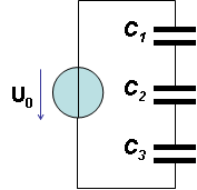 | Adatok:U0 = 7 VC1 = 4 µFC2 = 1 µFC3 = 9 µF