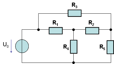 | Adatok:U0 = 42 VR1 = 3 ΩR2 = 5 ΩR3 = 5 ΩR4 = 3 ΩR5 = 2 Ω