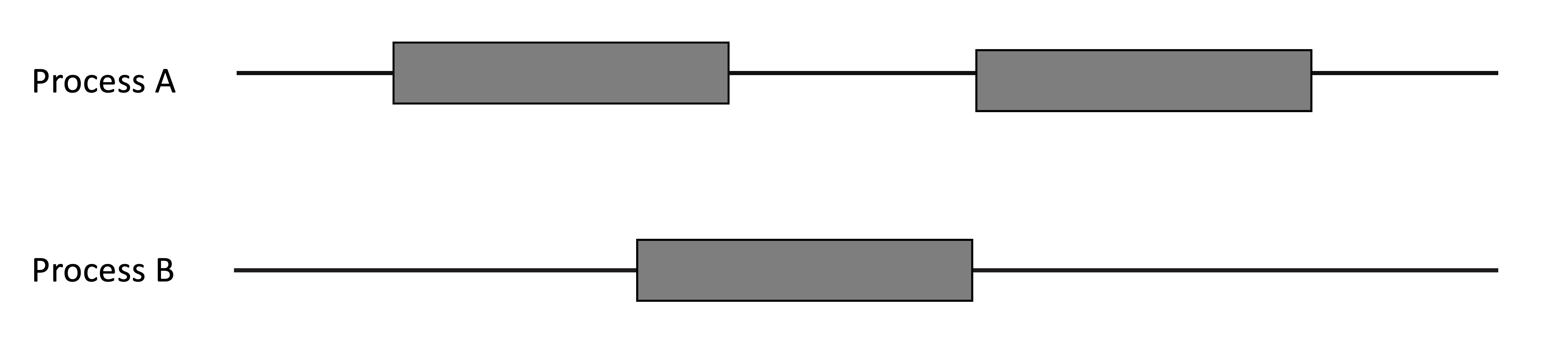 The following picture represents two processes running in parallel. Time flows from left to right, and grey boxes represent the time spent by the processes in their critical regions. Does this execution enforce mutual exclusion?