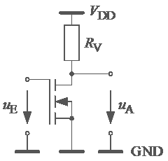 Worin besteht einer der Nachteile des Lastinverters entsprechend folgender Abbildung im Vergleich zu einem CMOS-Inverter? (Es werden gleich große n-Kanal-Transistoren in beiden Inverter-Varianten angenommen.)