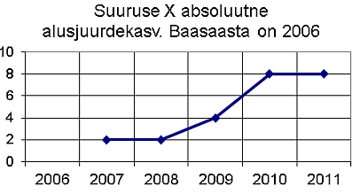 Diagrammil on toodud suuruse X absoluutne alusjuurdekasv, baasaastaks on võetud aasta 2006. Mitme ühiku võrra oli suuruse X väärtus aastal 2011 suurem X väärtusest aastal 2009?