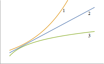 Joonisel on kolm erineva kujuga trendijoont. Sea vastavusse, milline joon millisele valemile vastab.