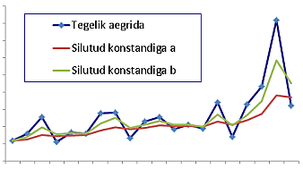Diagrammil on kasutatud aegrea eksponentsilumist kahe erineva silumiskonstandiga a ja b. Kumma silumiskonstandi väärtus on suurem?