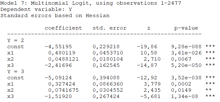 Sõltuv tunnus Y on mõõdetud nimiskaalas ja sel on kolm väärtust. Väärtused on kodeeritud 1, 2, 3. Hindamiseks kasutati multinominaalset logit mudelit, milles on 3 seletavat tunnust. Mudeli aruanne: