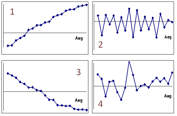 Joonisel on toodud nelja erineva aegrea graafikud. Millal on autokorrelatsioon positiivne, millal negatiivne ja millal puudub?