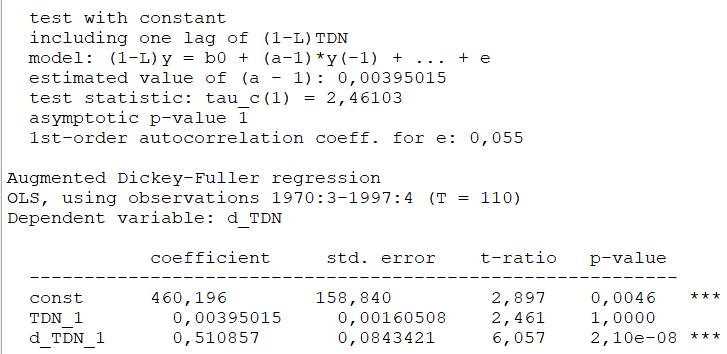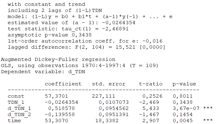Testiti ühikjuurt aegrea TDN korral. Esitatud on aruanded konstandiga ning konstandi ja trendiga mudeli kasutamisel. Kas see aegrida on stohhastilise trendiga või deteministliku trendiga?