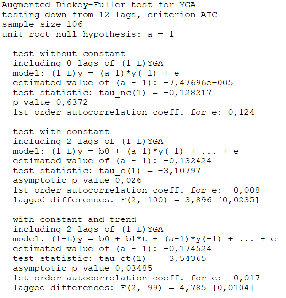 Testiti ühikjuurt aegrea YGA korral. Kasutati ilma konstandita, konstandiga ning konstandi ja trendiga mudelit. Kas aegrida on mittestatsionaarne või statsionaarne?