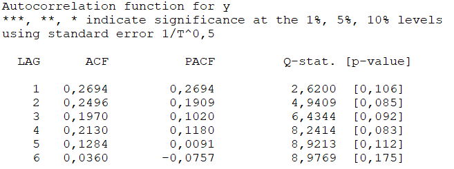 Joonisel on toodud ühe korrelogrammi tabel Gretlis. Vali, millised on 6. viitajale vastavate suuruste väärtused.