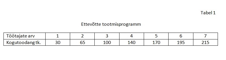 Tabelis 1 on toodud ettevõtte tootmisprogrammi fragment. Eeldades, et ettvõtte oma kapitali suurust ei muuda leia kui suur on seitsmenda töötaja värbamisest saadav piirtoodang.