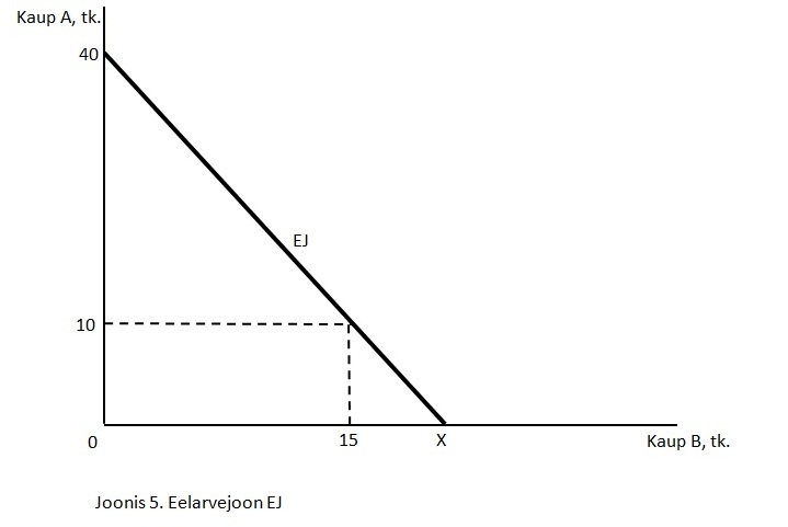 Joonisel 5 on toodud eelarvejoon (EJ). Ette on antud, et kauba A hind on 5 eurot. Kui palju saab osta kogu eelarve raha eest kaupa B (leia X väärtus jooniselt).