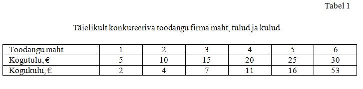 Tabelis 1 on toodud firma majandusinfo. Mitu ühikut peakse antud firma tootma lähtudes optimaalse tootmismahu "kuldreeglist", et ta maksimeeriks oma kasumit.