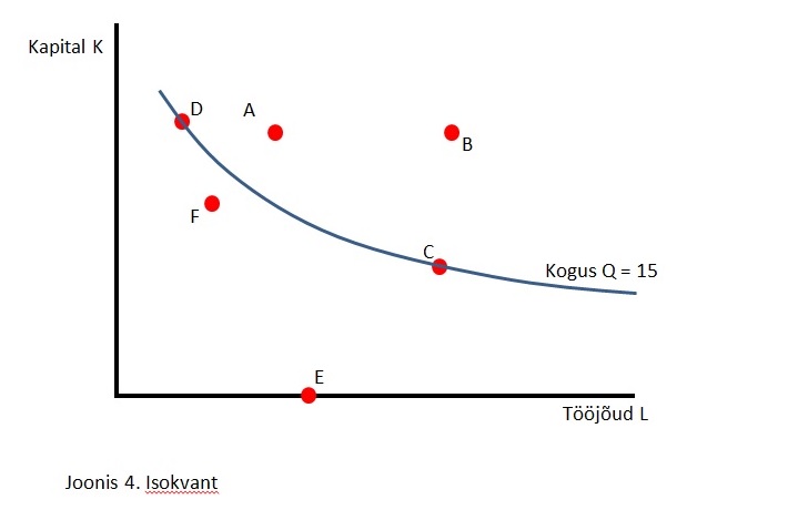 Joonisel 4 on toodud isokvant. Missugused antud joonisel kujutatud punktid näitavad tehniliselt efektiivset tootmist?