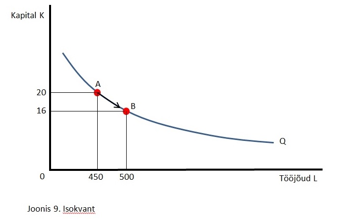 Joonisel 9 0n toodud isokvant. Arvuta tehnilise asenduse piirnorm, tingimusel, et kapitali kogus vähenes liikumisega punktist A punkti B.