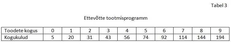 Tabelis 3 on toodud ettevõtte tootmisprogramm. Lähtudes toodud tootmisprogrammist arvuta kui suur on viienda tooteühiku piirkulu.