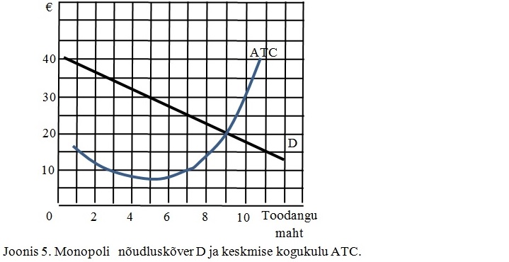Joonisel 5 on toodud monopoli nõudluskõver. Leie joonise abil kui suur on monopoli kogukasum 9 tooteühiku müügist.