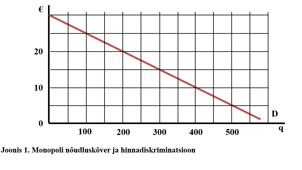 Leia joonisel 1 toodud monopoli nõudluskõvera alusel kui suur on tarbija tuluefekt kui monopol kasutab hinnadiskrimineerimist ning müüb erinevatele tarbijatele oma toodet hindadega 25, 20 ja 15 €.