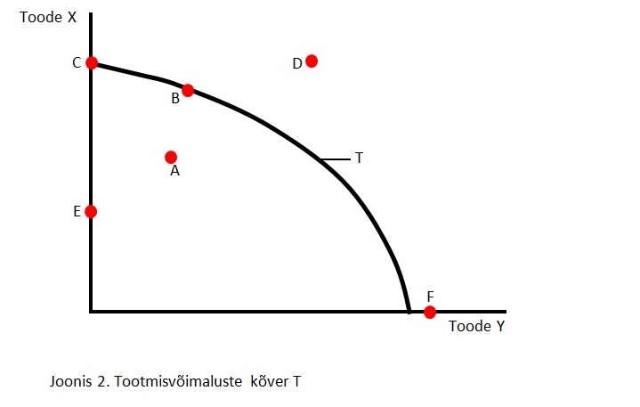 Joonisel 2 on tootmisvõimaluste kõver T. Millised joonisel toodud punktidest on tootmises ebaefektiivsed?