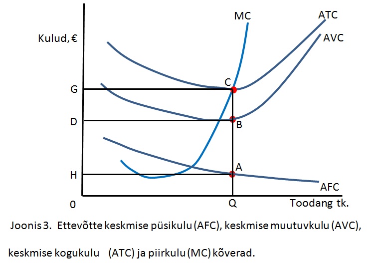 Joonisel 3 on toodud ettevõtte erineva kulukõverad. Vasta joonise 3 baasil missugune pindala või lõik vastab ettevõtte keskmistele muutuvkuludele.