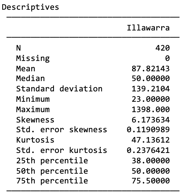 The Air Quality Index (AQI) is a measure of air pollution, combining measurements of ozone, carbon monoxide, sulfur dioxide, nitrogen dioxide, airborne particles and visibility into a single index. The AQI for 420 days measured in the Illawarra region, NSW was plotted and summarised below.