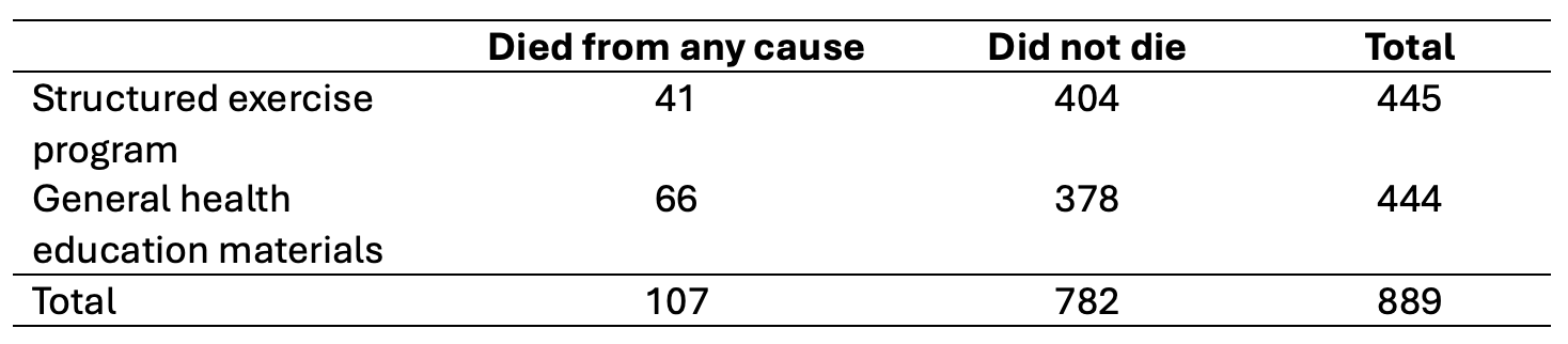 A randomised controlled trial was undertaken to examine the effect of exercise on overall mortality in people with resected colon cancer who had completed chemotherapy. 445 participants were randomised to receive a structured excercise program, and 444 received general health-education materials. The results of the trial are given below: