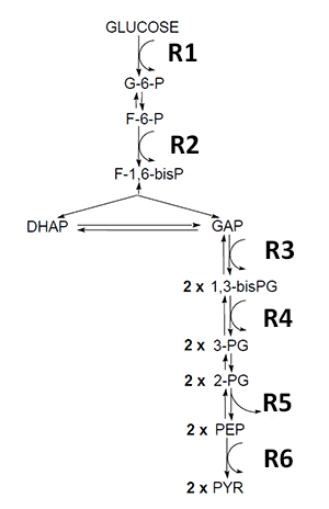 The diagram shows various reactions of the glycolytic pathway. Which reaction(s) produces ATP as its product?