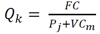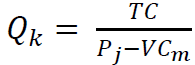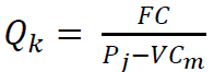 Stanovenie kritického množstva výroby Qk (kde sa náklady = výnosom) sa za predpokladu, že FC= fixné náklady, Pj= jednotková cena, VCm= merné variabilné náklady (na jednotu produkcie), TC= celkové náklady, určí ako :
