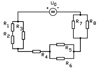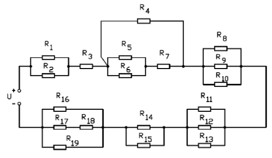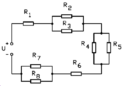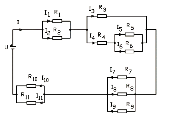 Vypočítajte celkový odpor Rc [], napätia U1, U6, U9, U11 [V] a prúdy I až I11 [A] (vyznačené v schéme) ak je dané:
