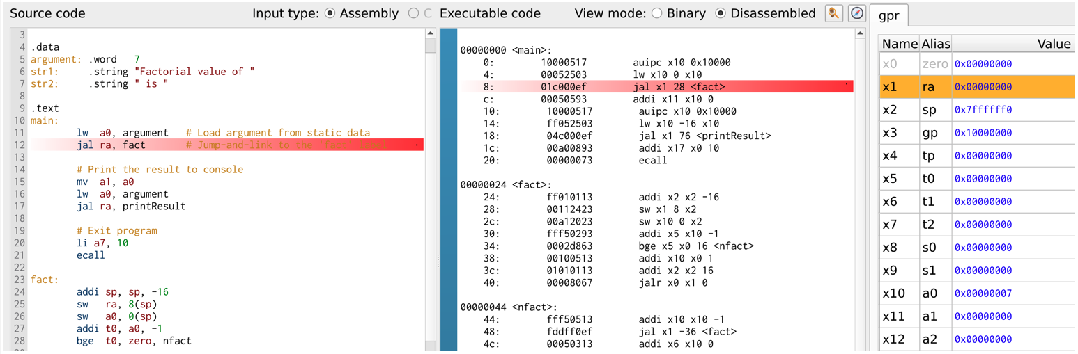 La figura es una captura del estado del procesador antes de empezar la ejecución de la instrucción jal ra,fact en el programa factorial.asm en la configuración de procesador uniciclo.