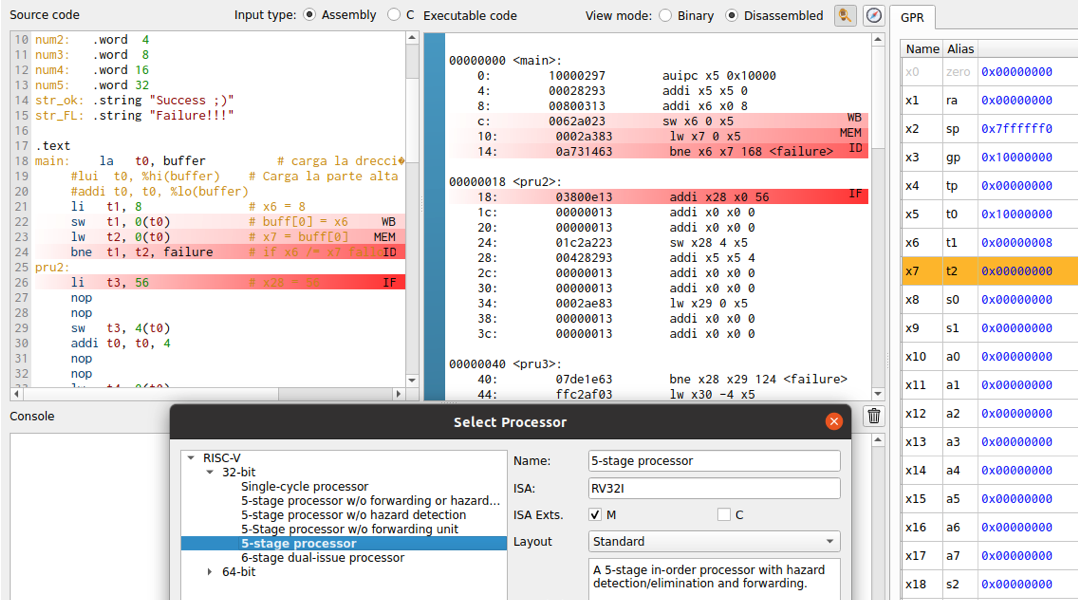 La figura es una captura del estado del procesador en la etapa MEM de la instrucción lw t2, 0(t0) en el programa riscv_pruBasico.asm y con la configuración de procesador segmentado en 5 etapas con detección de riesgos y adelantamiento de datos.