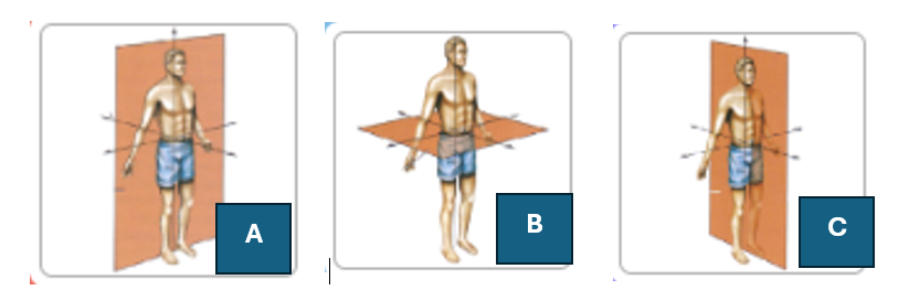 De las siguientes imágenes, señale cual corresponde al plano frontal o coronal, que divide al cuerpo en anterior y posterior.