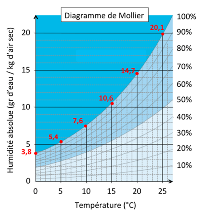 Dans une pièce fermée, la température est de 18°C et l’humidité relative est 50%. Dehors, la température est 22°C et l’humidité relative est aussi de 50%.